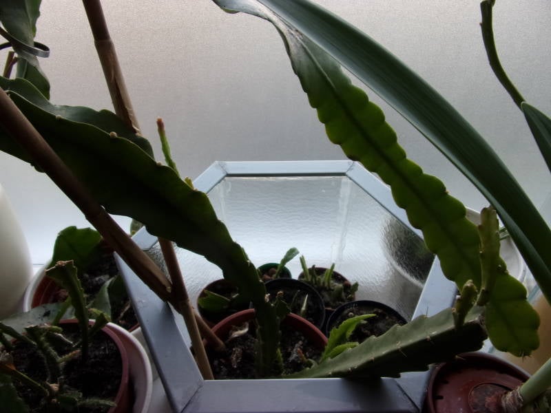 Het is weer april en de Epiphyllums komen langzaam aan weer in de knop en ook begint de groei van scheuten met een rosige gloed in de topjes. Afwachten wat de planten gaan doen. Ik probeer de bloempotten geleidelijk aan te verwisselen voor glazen kweekbakjes, terrariums. Dit om warmte en vochtigheid bij de planten wat te helpen in stand te houden. Het blijven sub-tropische planten en Epiphyten, een soort van planten die van nature groeien op andere planten / bomen in holten. Met betrekkelijk weinig wortels in staat om uit de vochtige lucht deels het vocht te halen om te groeien. Een humusrijke en luchtige bodemstructuur , goed vocht doorlatend, niet te nat maar wel iets vochtig is gewenst. Ik probeer ook het stekken van de bladcactus weer verder te ontwikkelen. Met diverse methodes, gebruikelijke en minder gebruikelijke, meer eigen experiment trachten om de planten-delen te laten wortelen en uitgroeien tot volwassen planten die weer zullen kunnen gaan bloeien. De ervaring leert dat een broeierige lichte / warme / vochtige omgeving voorkeur heeft , maar geen direct zonlicht (bij de zon op hoogst van de dag, tussen circa 11:00 uur en 16:00 uur). Verder niet in direct water of te vochtige bodem / potgrond, met kans op rotting. Daarbij gelet op dat de snijwonde van het plantdeel eerst indrogen kan indien dit in bijvoorbeeld hydrokorrels, vermicullum of potgrond gezet om te wortelen. Zelf kies ik er dikwijls voor om de stek ondersteboven in het stekmedium te zetten om te laten wortelen. Dikwijls vormen zich van nature ook al wortels-beginsels in de toppen wanneer de plant wat droog gehouden wordt, of juist heel goed groeit. Na het wortelen en begin van groei van de stek , kan ik deze oppotten in een niet te grote pot appart of met meerdere stekken gelijktijdig in een iets grotere pot. Een terrarium met deksel kan tijdelijk de groei stimuleren , maar niet langer dan nodig want de kans op schimmelvorming of rot is redelijk groot. Dan de deksel openzetten of verwijderen en eerst de bak iets laten indrogen voordat ik weer voorzichtig een weinig water geef.