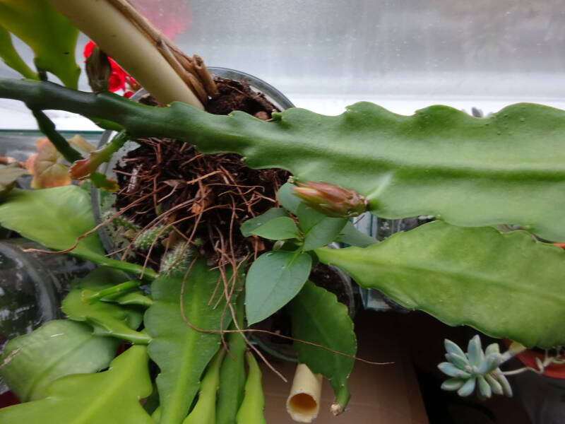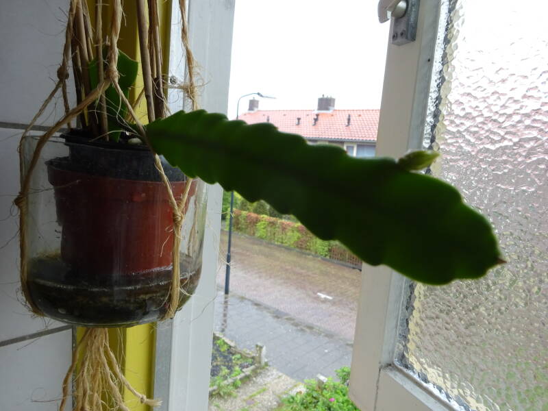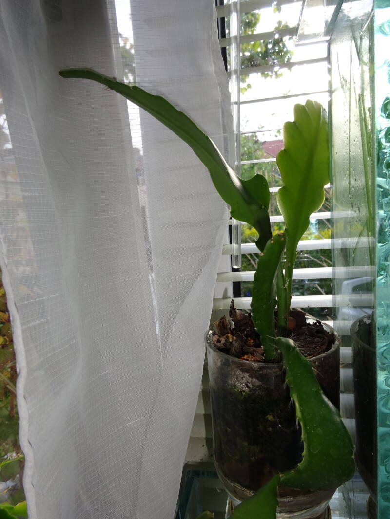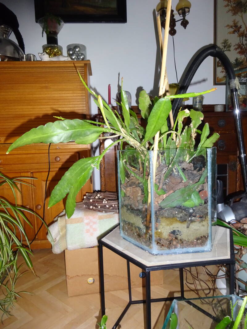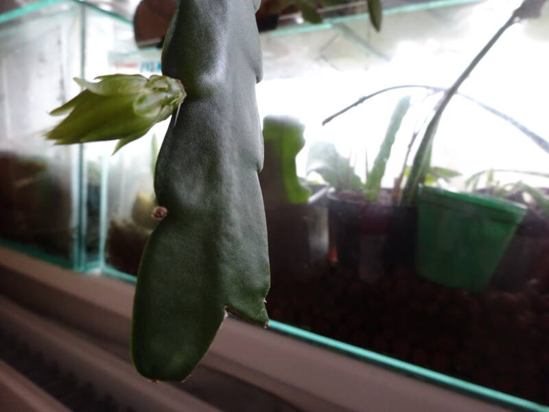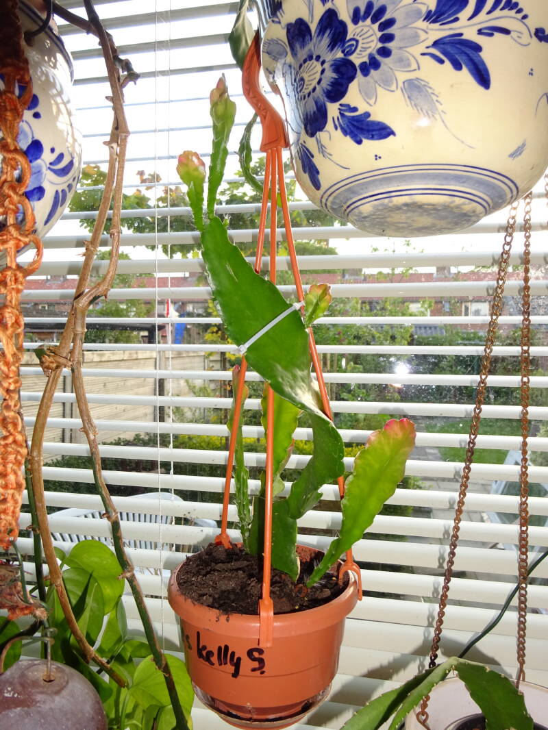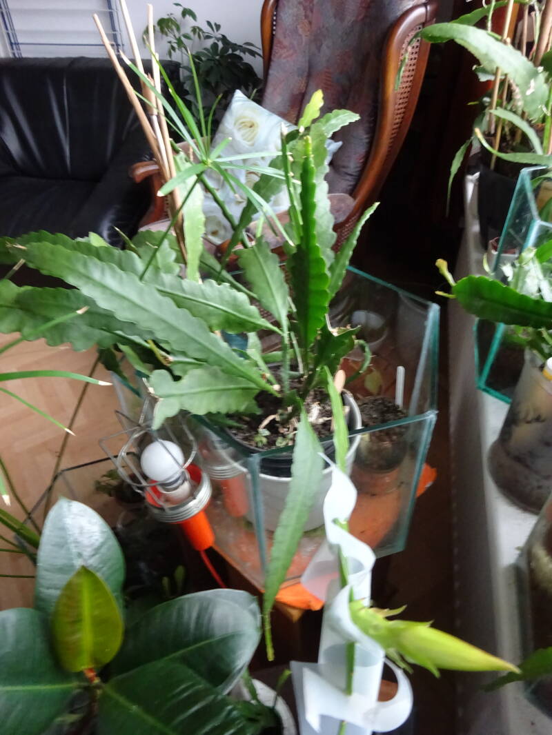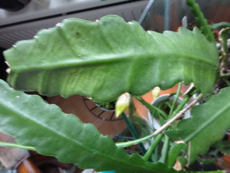 Een grote plant met knoppen. Dit was mijn eerste mini-stekje geweest, welk ik liet wortelen in een turfpotje met grondmix, welk als stekelige cactus uitgroeide en later pas wanneer de stek uitgroeide de oorspronkelijke groeivorm aan nam, met platte bladstengels zonder stekels, aan de flanken gelobt, dan wel met tepels, als bij eikenblad ( maar dan iets minder).