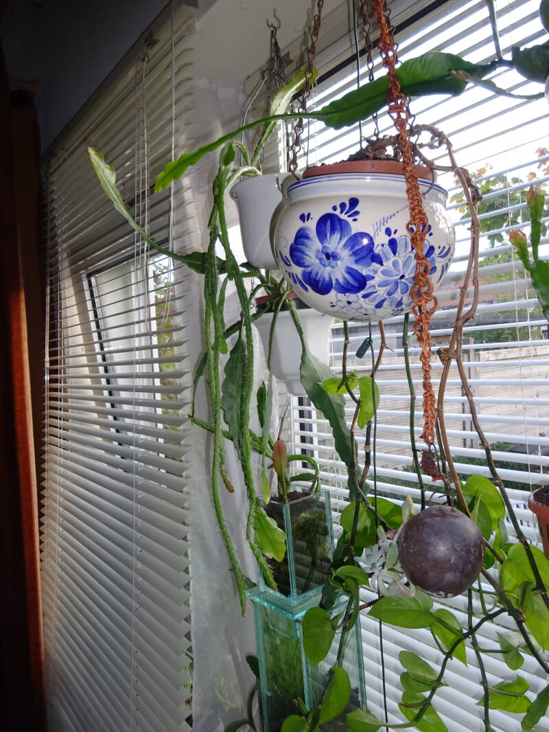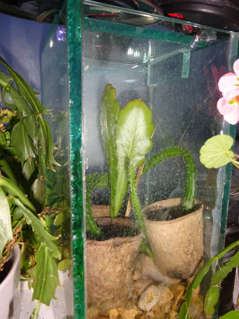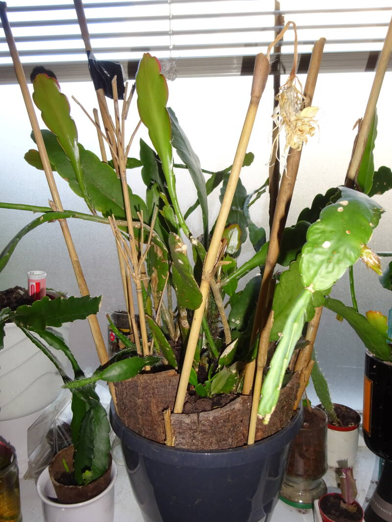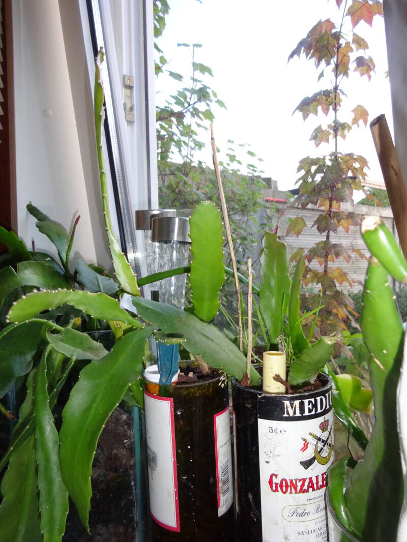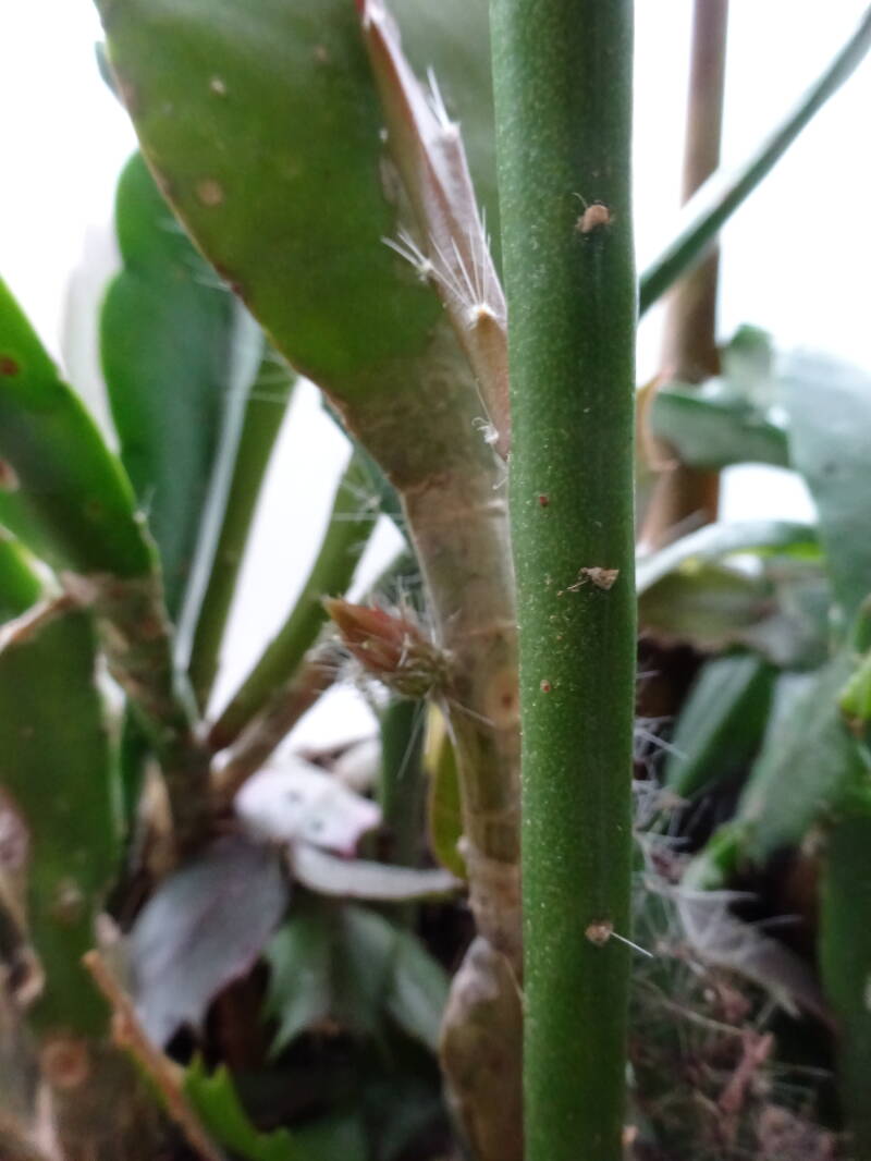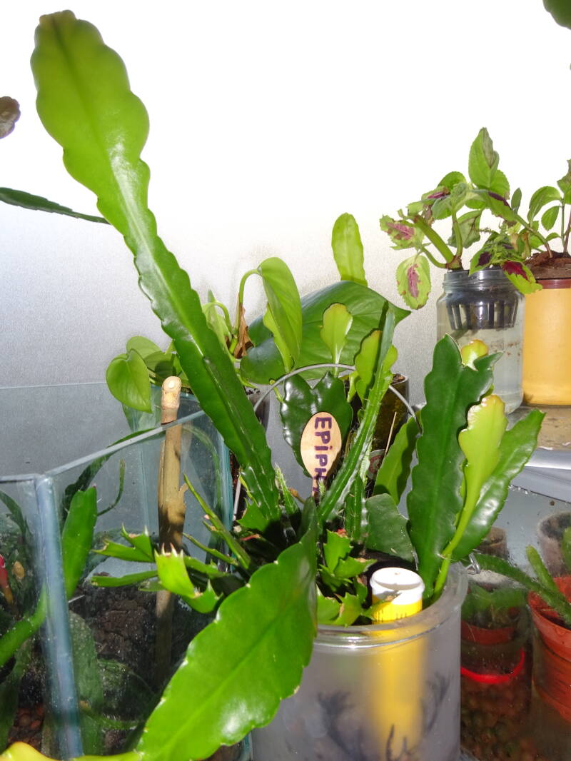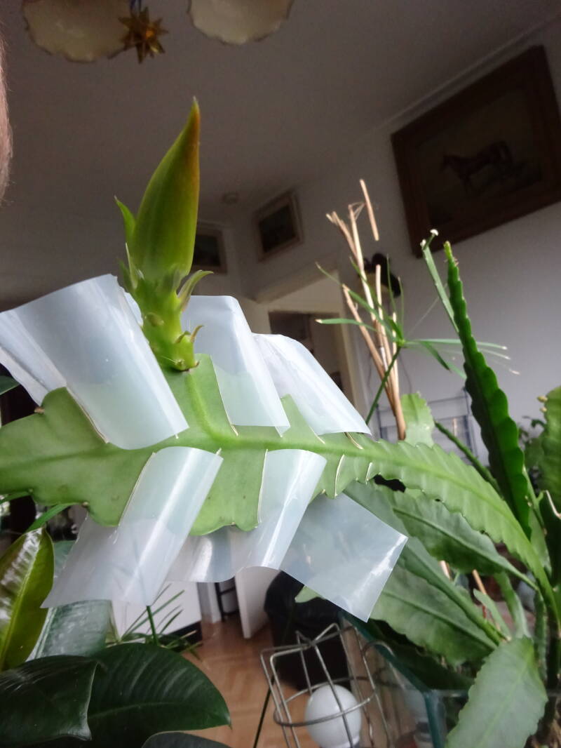 Een grote plant met knoppen. Dit was mijn eerste mini-stekje geweest, welk ik liet wortelen in een turfpotje met grondmix, welk als stekelige cactus uitgroeide en later pas wanneer de stek uitgroeide de oorspronkelijke groeivorm aan nam, met platte bladstengels zonder stekels, aan de flanken gelobt, dan wel met tepels, als bij eikenblad ( maar dan iets minder).